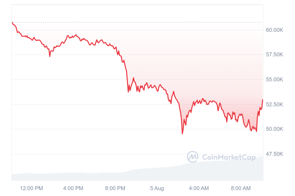 Sur les dernières 24 heures, le prix du BTC a reculé de 12,84 %. En conséquence, l’actif est même temporairement retourné sous les 50 000 $ avec une mèche autour des 49 000 $.