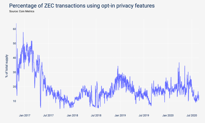 Bien qu’il s’agisse de l’une des plus grandes cibles initiales du mouvement cypherpunk original, les données des transactions quotidiennes montrent que, d’un maximum de près de 60% en janvier 2017, environ 10% seulement des transactions quotidiennes de Zcash utilisent ses fonctions de confidentialité optionnelles.