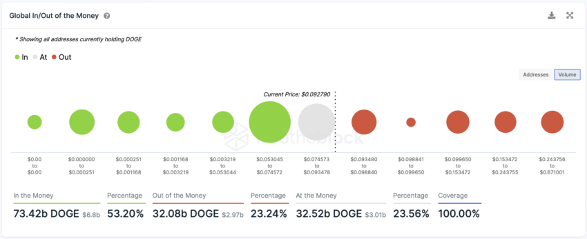 La hausse affichée par le cours de Dogecoin au cours des 30 derniers jours l’a aidé à regagner une importante zone de support. L’indicateur Global In/Out of the Money d’IntoTheBlock nous révèle également que plus de 830 000 adresses ont acheté plus de 78 milliards de DOGE autour de 0,075 $. Tant que cet important barrage de demande se maintient, le cours du meme coin pourrait être bien positionné pour de nouveaux gains.
