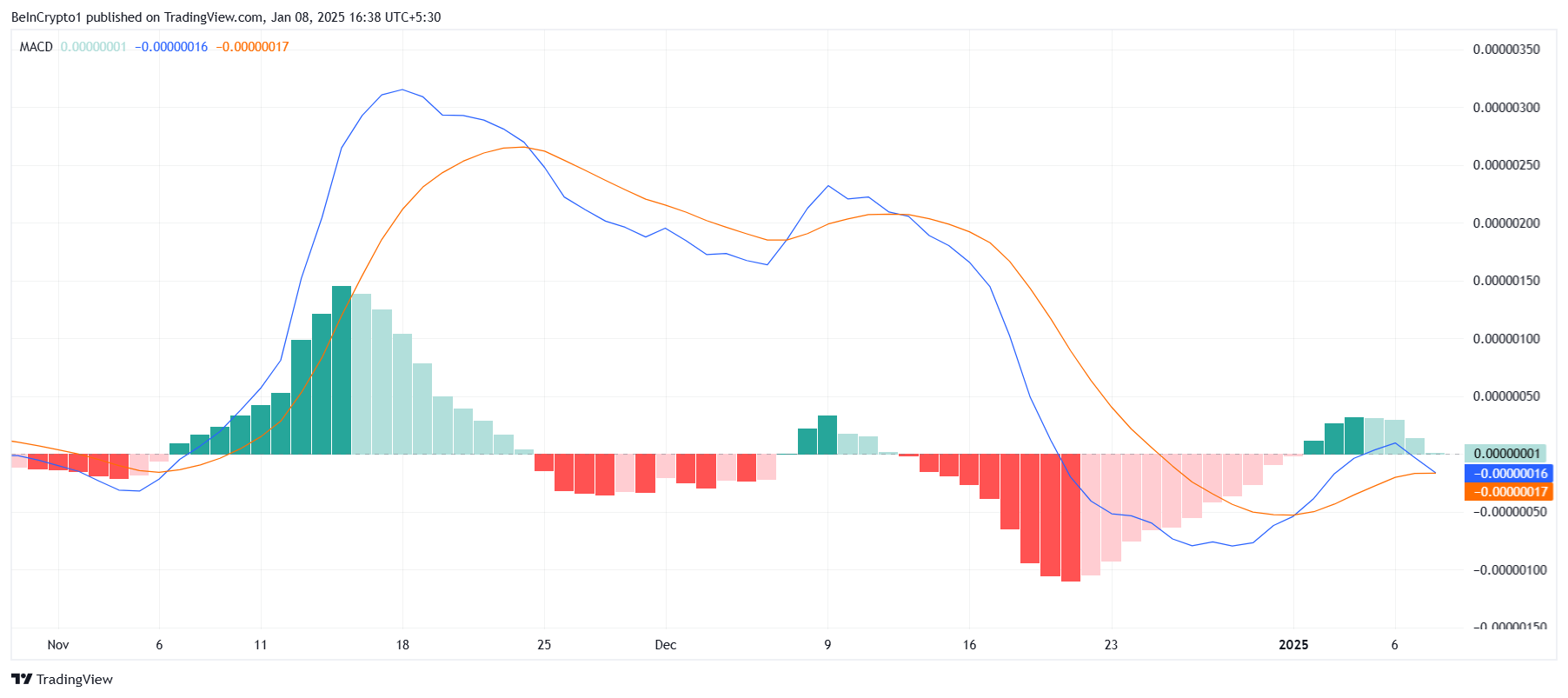 Cependant, le momentum macro de PEPE a pris un tournant baissier, comme le soulignent certains indicateurs techniques clés. En effet, la convergence et divergence des moyennes mobiles (MACD) est sur le point d’enregistrer un croisement baissier, signalant la fin du récent élan haussier pour le meme coin PEPE. Ce développement suit un bref croisement haussier survenu plus tôt, soulignant davantage la pression baissière actuelle.