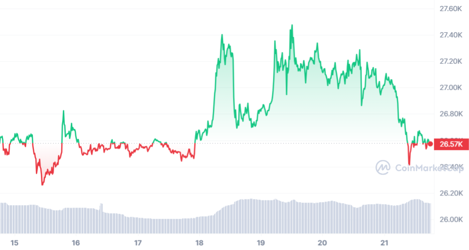 Le BTC a pour sa part perdu 1,80 % de sa market cap sur les dernières 24 heures. La cryptomonnaie s’échange désormais à 26 581 $.