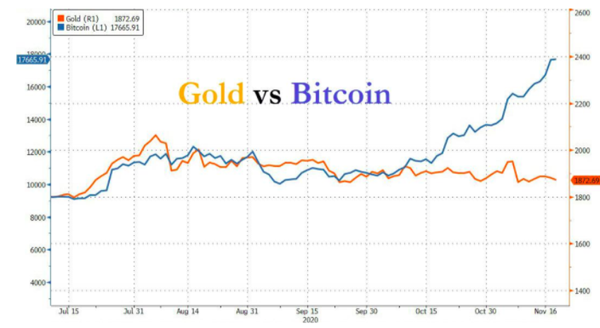 Alors que Bitcoin est en hausse de près de 150% cette année, l’or a gagné un peu plus de 20%. Le point commun est que les politiques monétaires et budgétaires de stimulation de l’inflation introduites en réponse au coronavirus semblent alimenter les deux actifs.