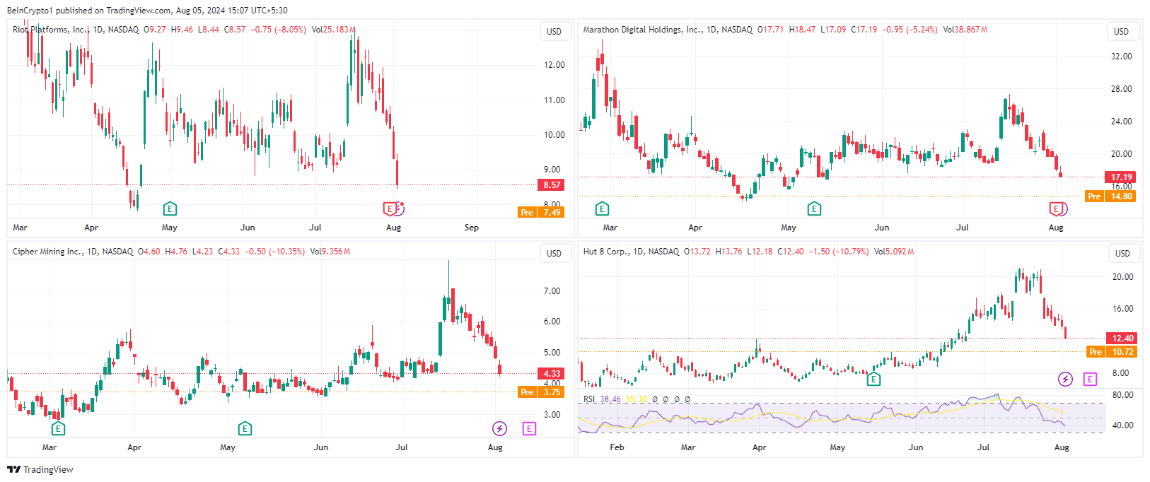 Les données de TradingView révèlent que les actions des entreprises de minage de cryptomonnaies américaines subissent également une chute, reflétant la faiblesse de Bitcoin. Riot Platforms Inc. (RIOT) a vu son cours chuter de 10 %, tombant à 8,57 $. MARA, anciennement Marathon Digital, est aussi en baisse, tout comme Cipher Mining et Hut.