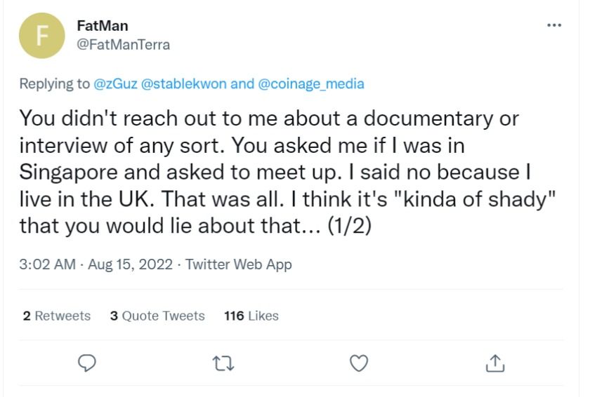 “Je ne dirais pas que tu as “couvert Terra”. Je dirais que tu as fait les louanges de Terra et de Do Kwon pendant très longtemps, fermant les yeux sur leurs points faibles et agissant comme un sycophante quand cela te convenait. Avec tout mon respect, je pense que n’importe quel journaliste dira que tu n’es pas très neutre”, a ajouté FatMan.