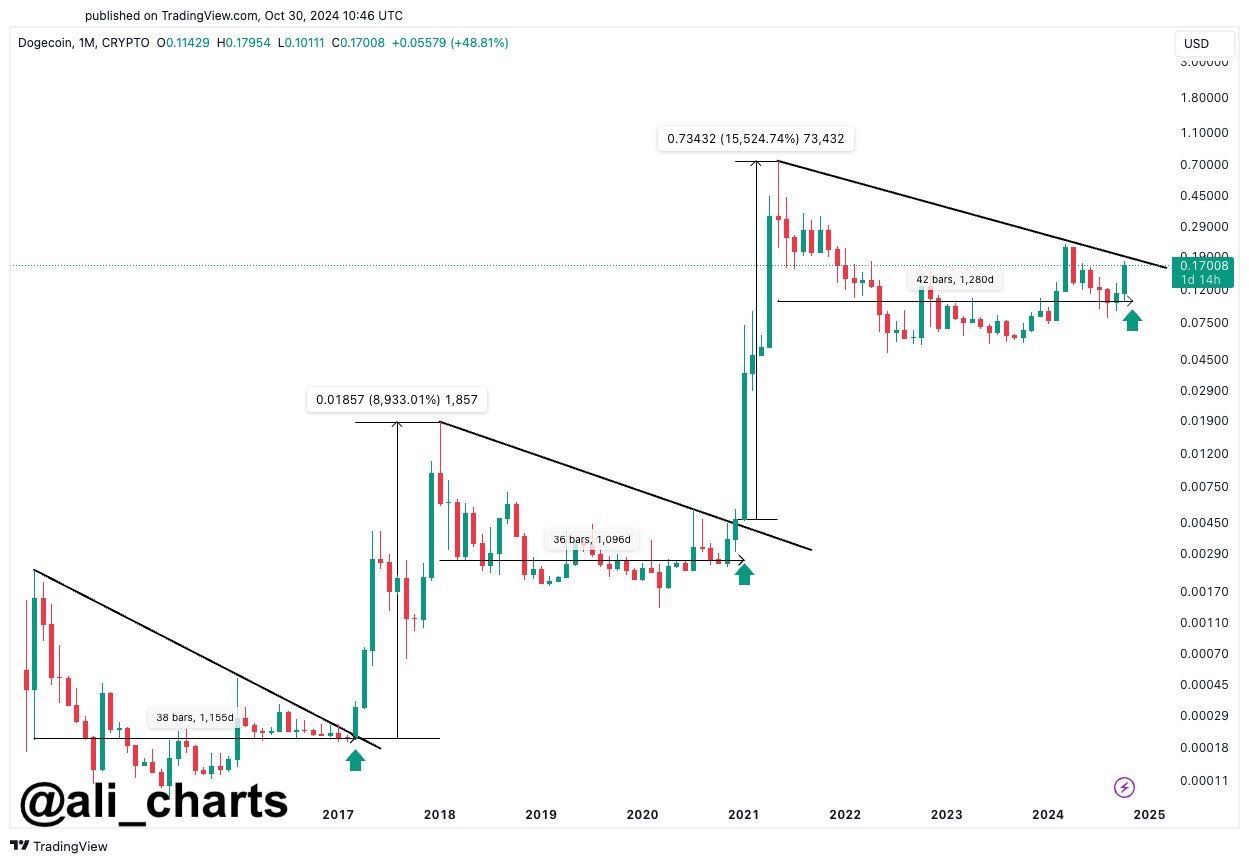 D’après Ali Charts, l’histoire suggère que le mois de novembre pourrait déclencher une hausse parabolique pour le DOGE, à condition que la crypto dépasse les 0,20 $ en clôture.