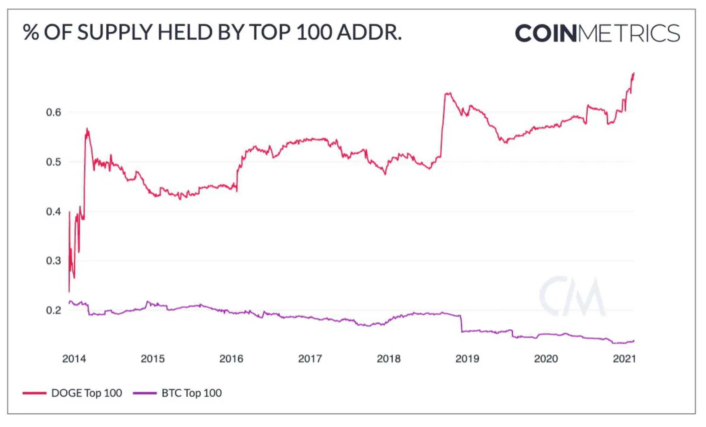 Une étude de Coin Metrics a révélé que 68,1% de l’offre de DOGE est concentrée entre les mains des 100 premiers portefeuilles, ce qui confirme les affirmations précédentes d’Elon Musk.