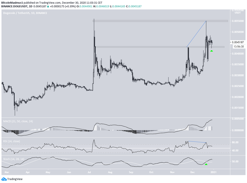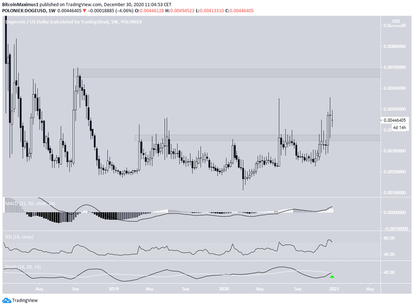 Le graphique hebdomadaire montre que le DOGE a dépassé la résistance des 0,0026$, avant de clôturer au-dessus de cette dernière. Il n’y était pas parvenu depuis le début de l’année 2019. Il a ensuite validé cette zone comme support.