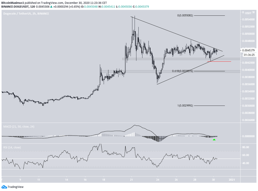 Une baisse en dessous du récent creux, situé à 0,0042$ (ligne rouge), invaliderait le triangle et suggérerait que le DOGE retournera au niveau des 0,004$ une fois de plus avant d’éventuellement monter.
