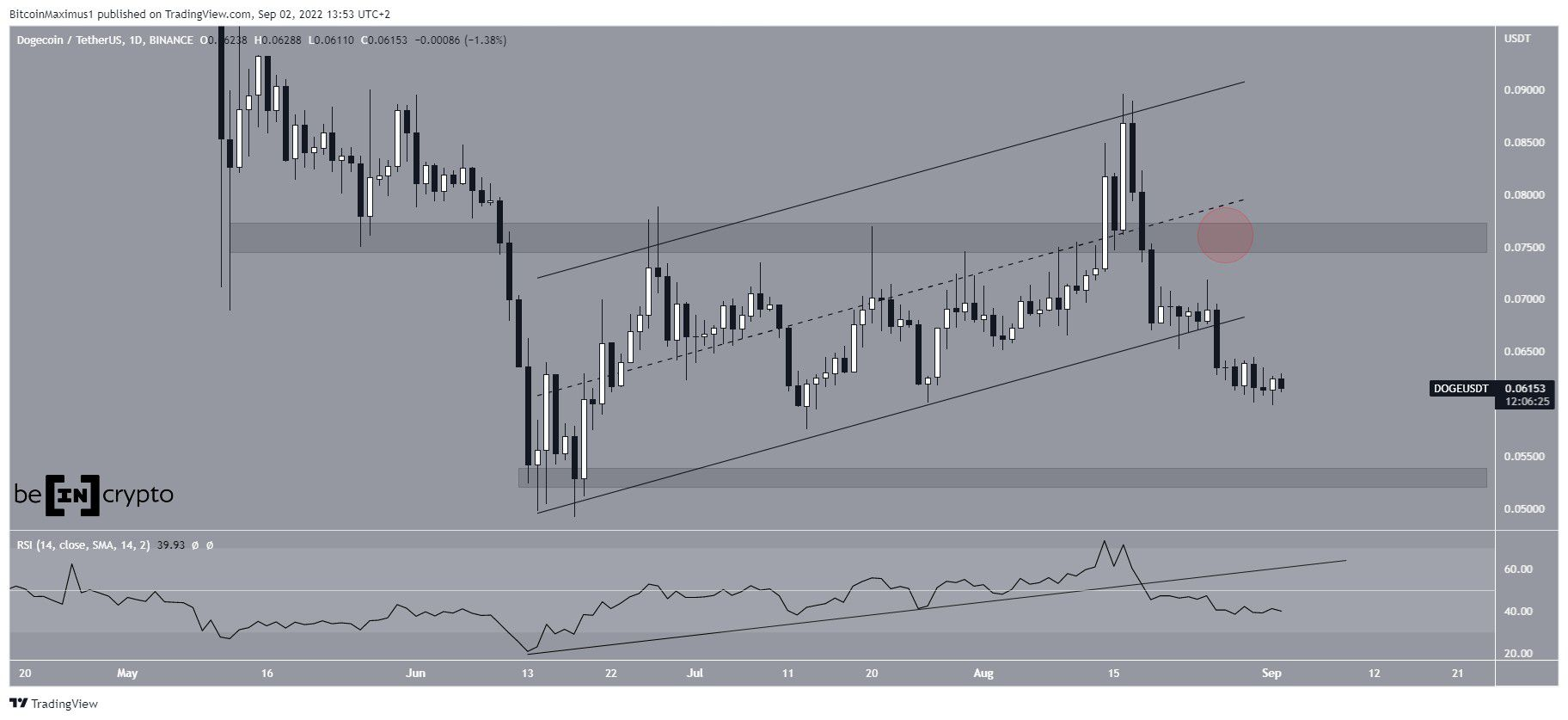 Le cours de DOGE s’est accru à l’intérieur d’un canal parallèle ascendant depuis le 14 juin. Le mouvement de hausse a conduit à un sommet de 0,089 $, atteignant la ligne de résistance de ce canal. Cependant, le cours a subi un rejet et se trouve depuis en baisse.
