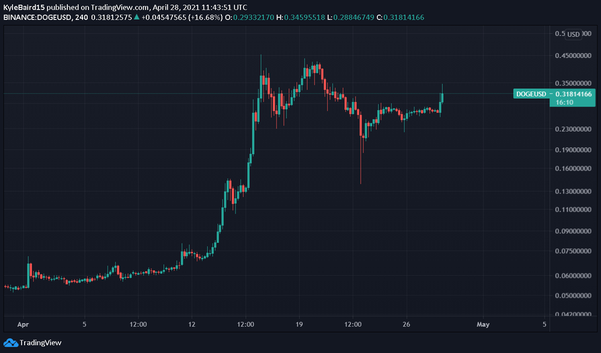 Bien que la référence à l’émission ait probablement fait connaître Dogecoin à des millions de nouveaux téléspectateurs, une autre référence plus récente a probablement eu une influence plus directe sur son prix. À 8h20 CET le 28 avril, le PDG de Tesla, Elon Musk, a tweeté “The Dogefather SNL May 8”.