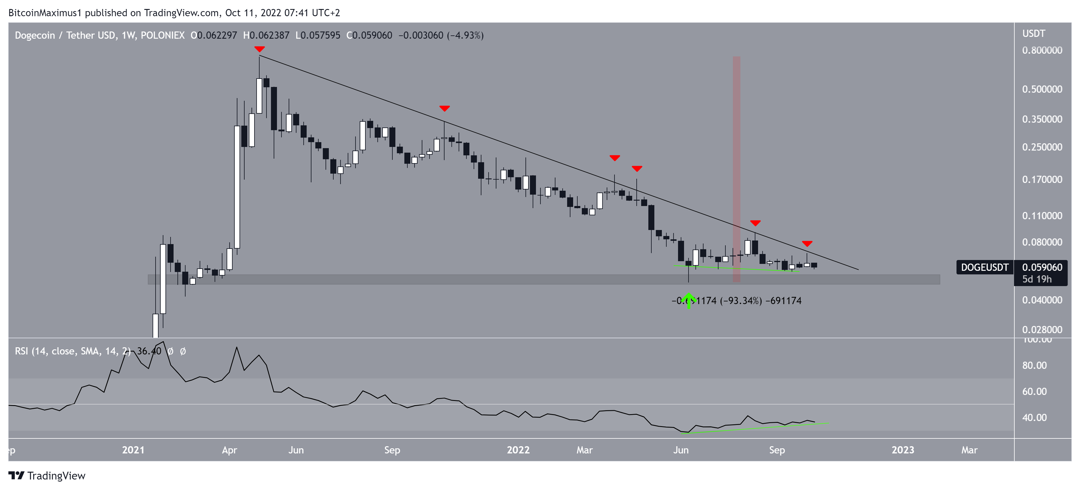 Le cours de DOGE décline sous une ligne de résistance descendante depuis son sommet record de 0,073 $ atteint en mai 2021.