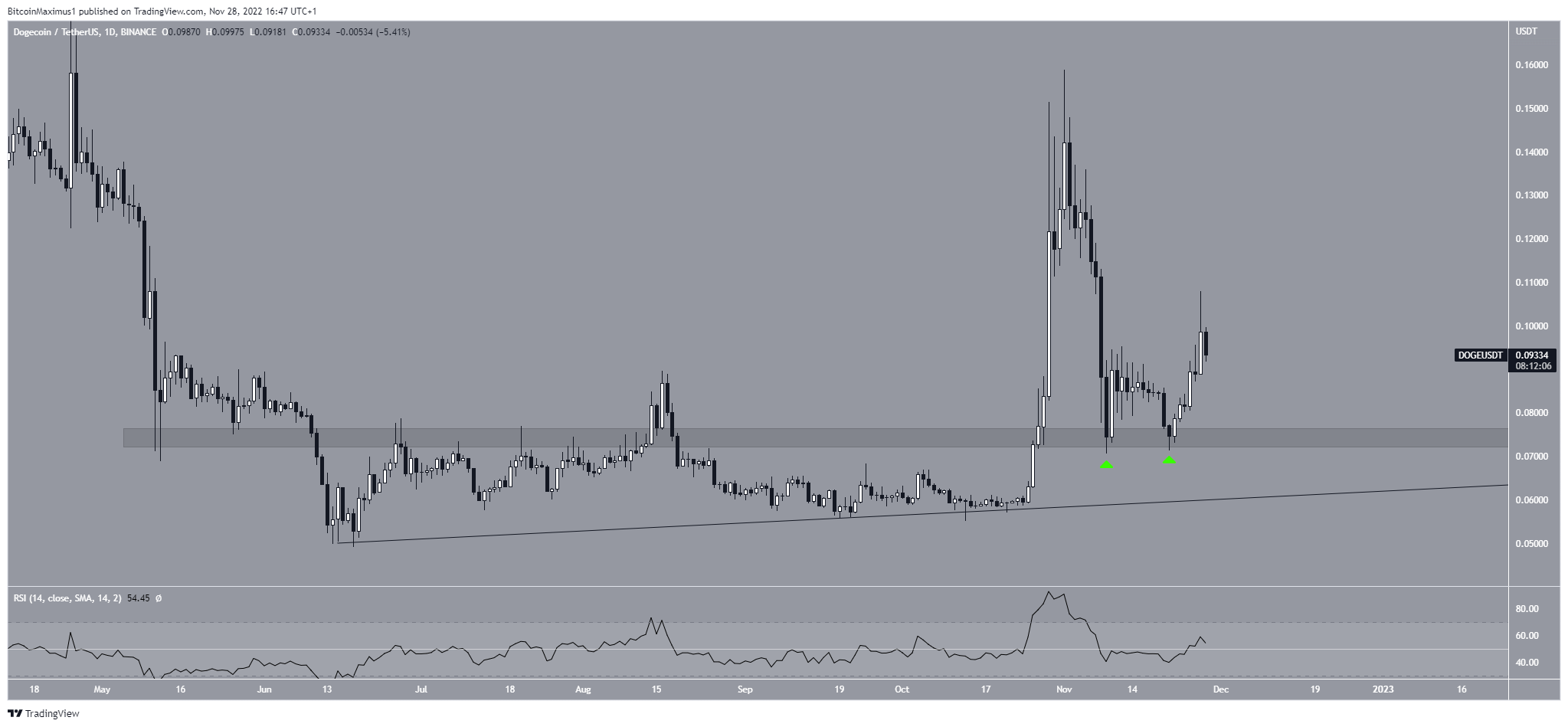 Le cours Dogecoin évolue à la baisse depuis son sommet à 0,159 $ du 1er novembre. Cette chute a été abrupte et a permis au cours de tester à nouveau la zone de support des 0,075 $. Arrivé à ce niveau, le DOGE a rebondi après avoir créé un schéma de double fond (flèches vertes). L’actif a alors atteint un sommet de 0,108 $ avant de subir un rejet, et a décliné au cours des dernières 24 heures.