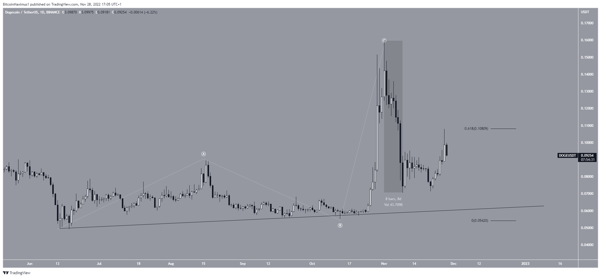 Si on revient aux données quotidiennes, le mouvement de déclin suivant ménèrait le cours DOGE au moins au niveau du creux de 0,054 $. Cet objectif est calculé sur la base d’une longueur de 0,618 du déclin initial (indiqué en gris foncé), et entraînerait une chute du cours sous la ligne de support ascendante.