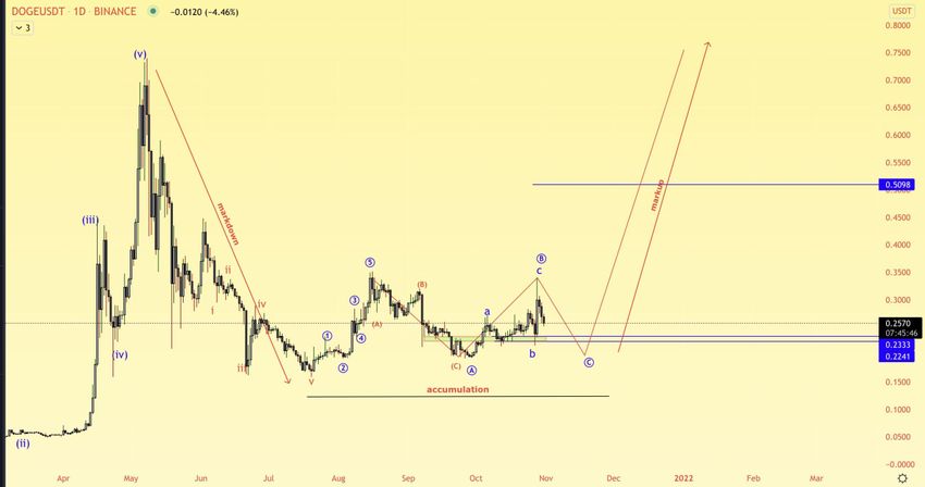 Le crypto-trader @Altstreetbet a partagé un graphique de Dogecoin, et dans lequel le token amrocerait un mouvement de hausse après avoir complété sa correction actuelle.