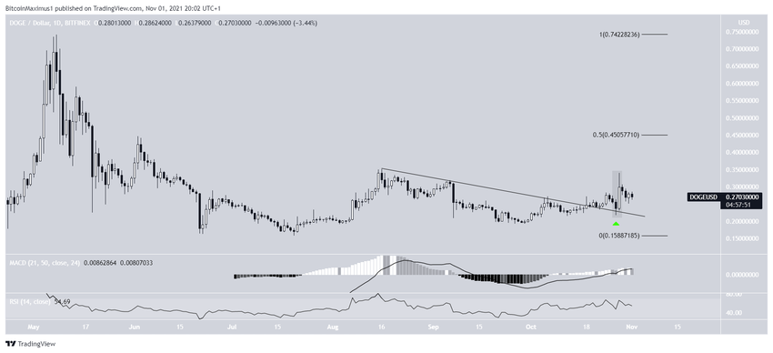 Bien que le DOGE n’ait pas encore dépassé ses sommets atteints au mois d’août, il a dépassé la ligne de résistance qui était en place depuis le 16 août. Le 27 octobre, il a validé cette dernière en tant que support, créant un chandelier japonais de recouvrement haussier.