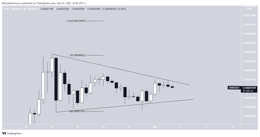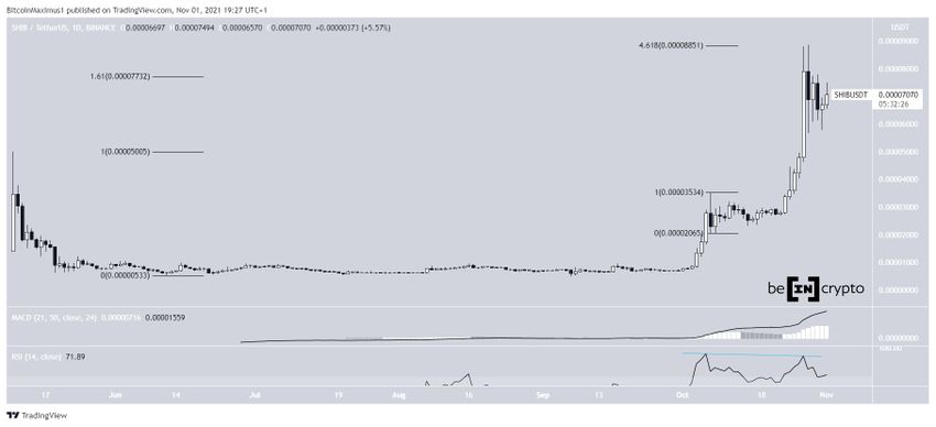 Le sommet de Shiba Inu se trouvait au niveau du retracement externe de long terme de Fibonacci 1,61, ainsi qu’au retracement externe de long terme de Fibonacci 4,618. Ces deux niveaux jouent souvent un rôle de résistance lorsque le cours atteint un nouveau sommet historique.