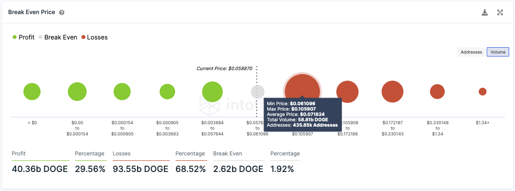 En observant l’indicateur Break Even Price d’IntoTheBlock, on constate que plus de 450 000 adresses ayant acheté 58,81 milliards de DOGE atteindraient amortiraient leurs achats entre 0,06 et 0,10 $. Ainsi, la fourchette de 0,06 $ à 0,10 $ agira comme une barrière de résistance majeure pour le cours de l’actif.