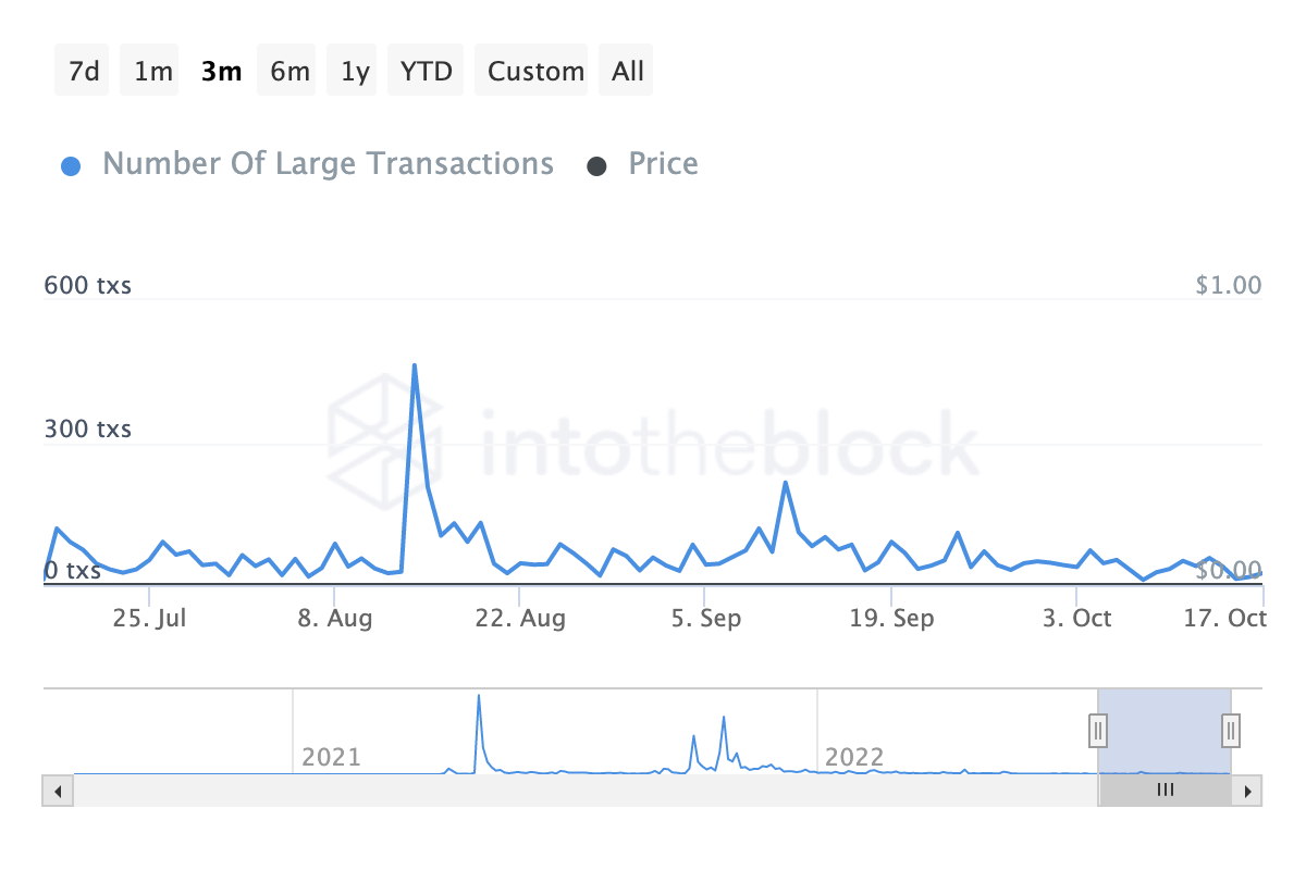 De plus, le nombre de transactions Shiba Inu d’une valeur supérieure à 100 000 dollars reste assez faible. Un tel comportement sur le marché indique une diminution de l’activité des baleines crypto. De même, cela suggère que les grands acteurs du marché crypto ne sont pas intéressés par l’achat de SHIB à son niveau actuel.