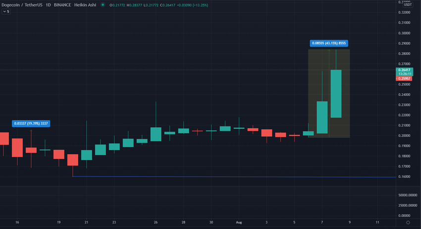 Dogecoin a ainsi connu un gain combiné de 43% depuis vendredi 6 août, passant de 0,198$ à un sommet de 0,287$ ce dimanche. Le 20 juillet, le cours du DOGE avait précédemment rebondi à son niveau de résistance situé à 0,16$.