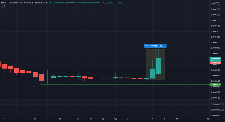 La corrélation entre le cours du DOGE et celui de son petit frère, le SHIB, a été évidente au cours du weekend, le crypto-mème ayant suivi l’évolution de Dogecoin. En effet, le SHIB a également connu une hausse de son prix depuis ce vendredi 6 août, passant de 0,00000613$ vendredi à 0,00000888$ ce dimanche. Il s’agit là d’un gain de 45%, similaire à celui du DOGE.
