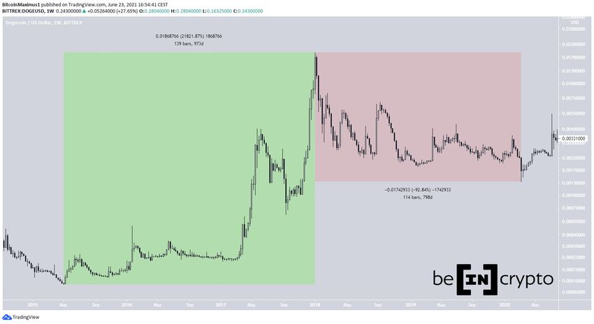 Dans cet article, BeInCrypto se penche sur le mouvement du cours de Dogecoin (DOGE) durant le cycle haussier de 2015-2018, ce afin de le comparer à son cycle actuel.