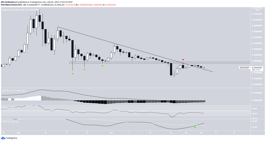 Le graphique quotidien du 3 juillet présente une image légèrement plus haussière. Alors que le DOGE suivait une ligne de résistance descendante depuis le 14 mai, il a réussi à la dépasser le 29 juin. De plus, l’oscillateur stochastique a réalisé un croisement haussier.