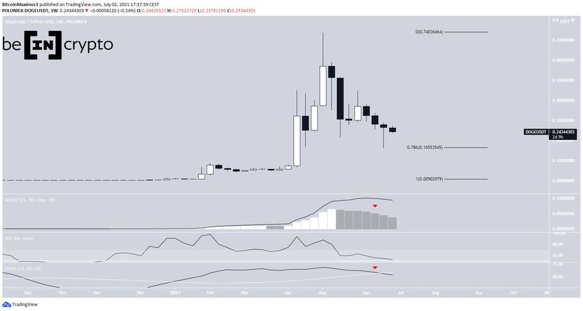 Depuis, le cours de Dogecoin était en déclin. Jusque-là, il est descendu jusqu’à un creux de 0,163$, ce le 21 juin. Ce creux se situait juste au niveau du retracement de Fibonacci 0,786. Un rebond s’en est suivi, laissant derrière lui une longue mèche inférieure.