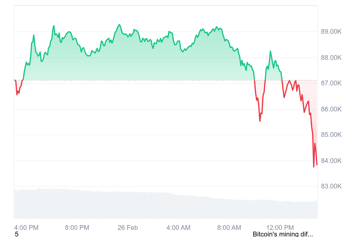 En conséquence, le cours du Bitcoin poursuit sa chute alors qu’il tentait en début de journée de repartir du bon pied. Au moment de rédaction, l’actif est même revenu sous les 84 000 $ avec une mèche à 83 200 $.