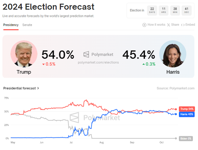 Les données de Polymarket indiquent que Donald Trump est en tête avec 54 % de soutien en sa faveur, contre 45,4 % pour Kamala Harris. Ce, avec encore 22 jours restants jusqu’au élections américaines. Trump est également en tête de nombreux états pivots clés comme dans l’Arizona, la Géorgie, la Pennsylvanie, le Michigan et le Wisconsin.