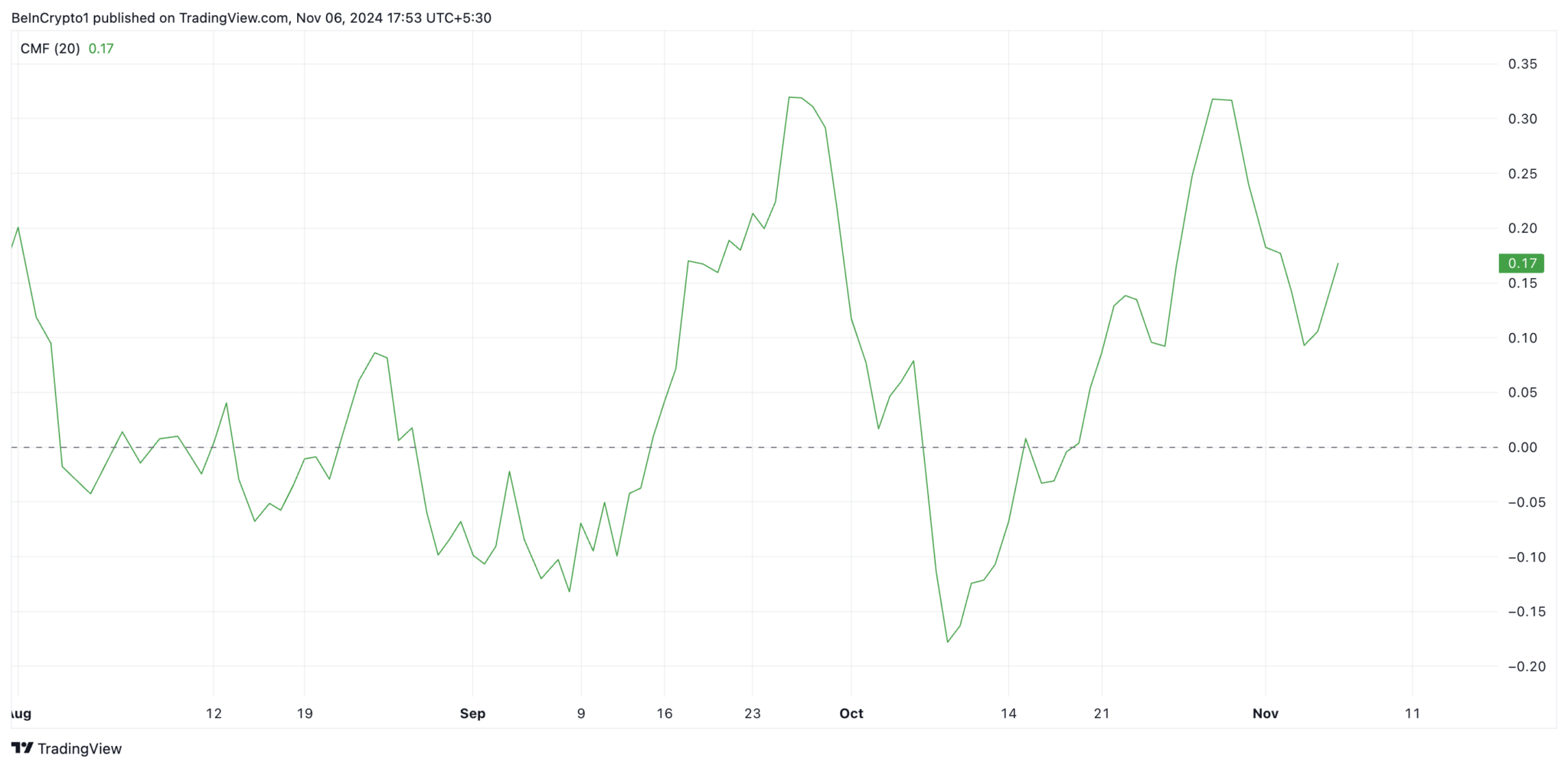 Le Chaikin Money Flow (CMF) actuellement positif du BTC, un indicateur qui suit les flux d’argent entrant et sortant du marché, soutient cette perspective haussière. En effet, il est actuellement orienté à la hausse à 0,17, bien au-dessus de zéro.