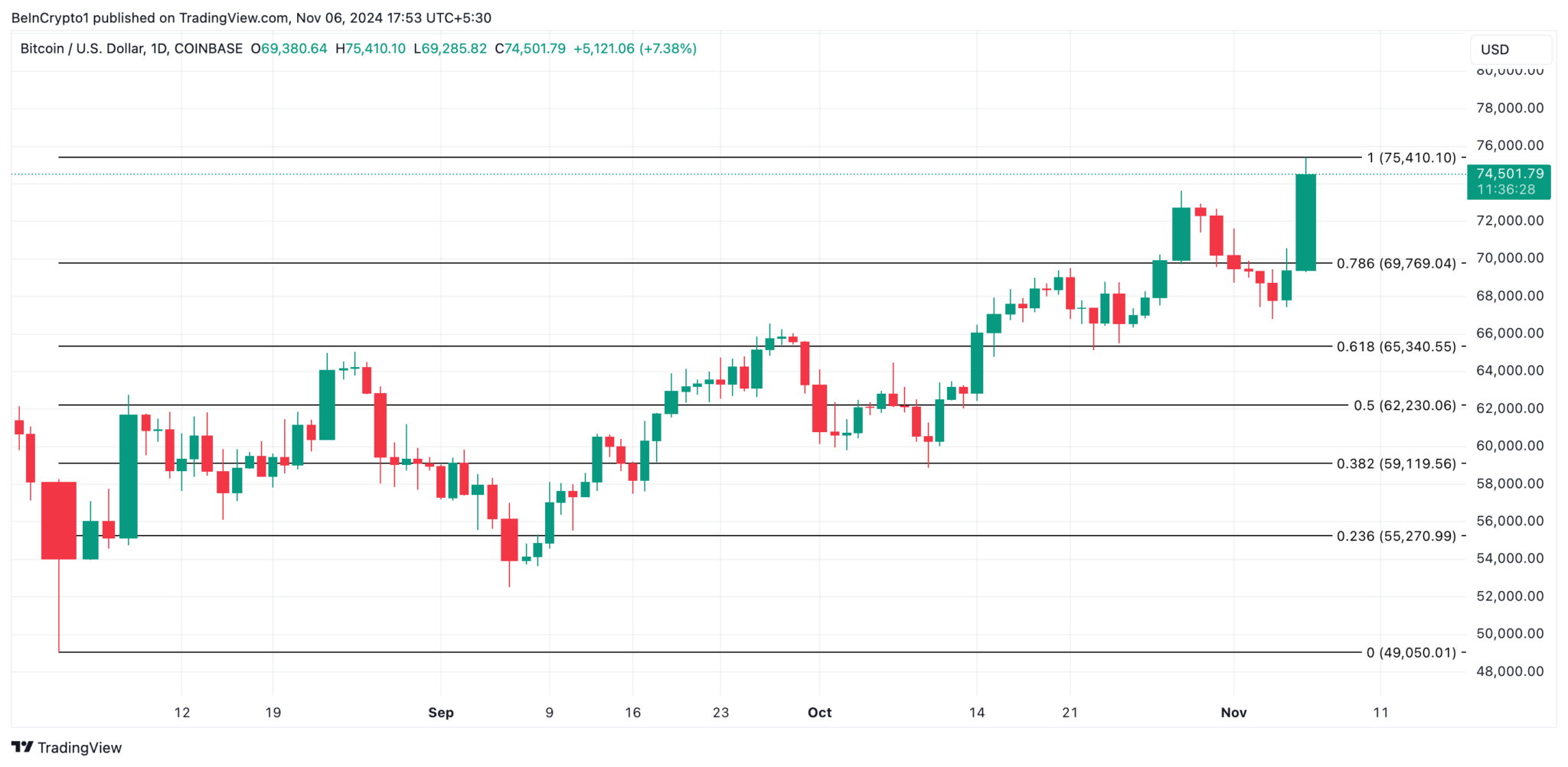 Cela indique un fort afflux de liquidités dans le BTC, ce qui pourrait le propulser vers et potentiellement au-delà de son récent sommet de 75 361 $.