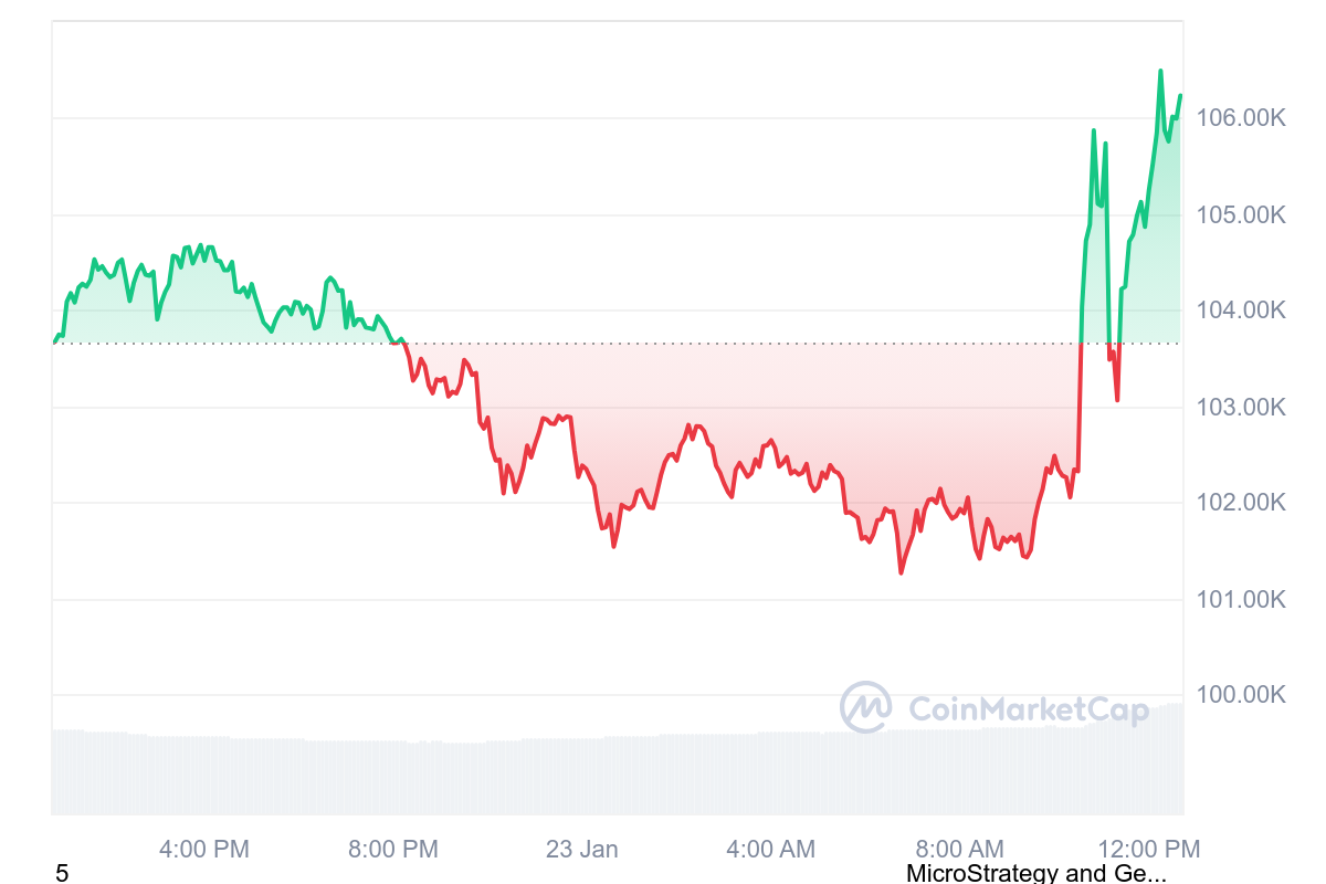 Au moment de rédaction, il vient de dépasser les 106 000 $ après une hausse proche des 5 000 $ par rapport au creux journalier.