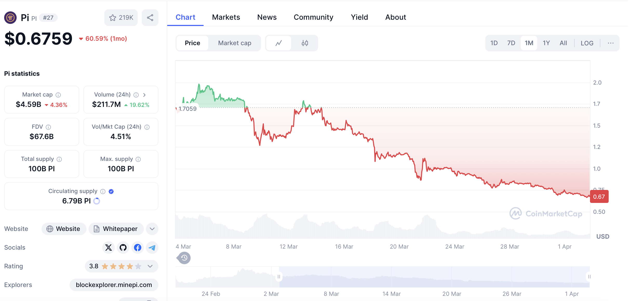 • Le token PI a chuté sous les 0,70 $, malgré une adoption massive et une activité réseau dynamique.