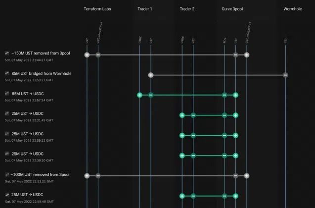 Selon les experts, tout a commencé dans la nuit du 7 mai, lorsque Terraform Labs a retiré 150 millions de dollars américains du pool de liquidités 3pool basé sur Curve. Cette opération, importante et exceptionnelle, a ainsi augmenté la volatilité du pool.