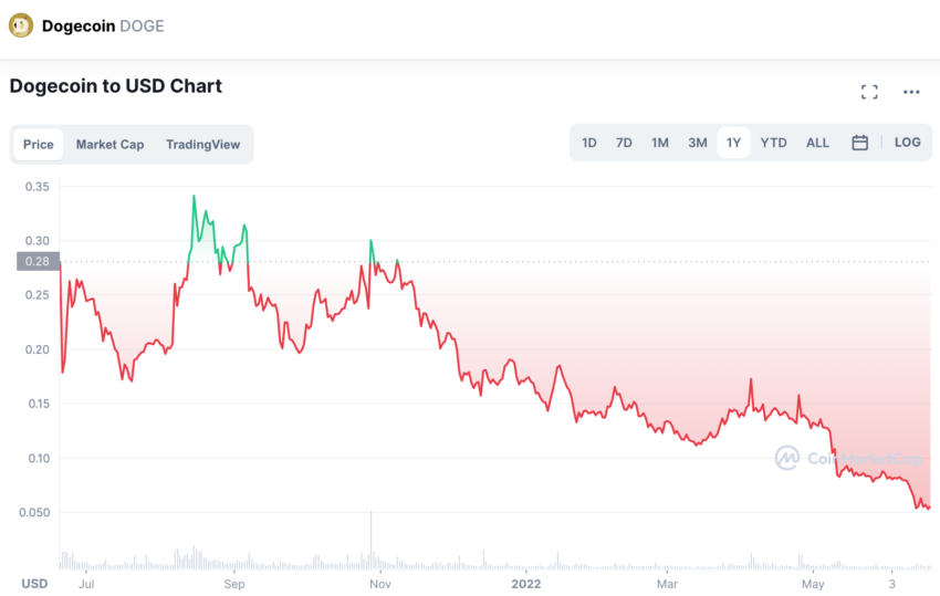 Le cours de Dogecoin est en forte baisse, tandis que Bitcoin continue de chuter et se trouve actuellement dans la fourchette des 18 000 dollars au moment de la rédaction de cet article. Cela dit, les altcoins subissent des chutes encore plus importantes. Au cours de l’année, Dogecoin a chuté régulièrement à ses prix pré-hype, lesquels avaient été acquis en grande partie grâce au soutien ouvert de Musk.
