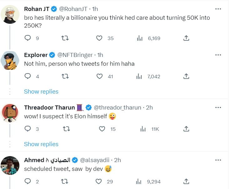 Elon Musk ayant tweeté depuis son compte Twitter personnel, il est évidement un des “suspects” potentiels de l’affaire. Cependant, cela a suscité l’incompréhension des internautes. En effet, puisque premièrement, le patron du réseau social étant multi-millardaire, un million de dollars en plus ou en moins ne semble pas avoir une grande incidence sur son patrimoine. Notamment lorsqu’il est susceptible de gagner (ou perdre) des dizaines de milliards sur une seule journée.