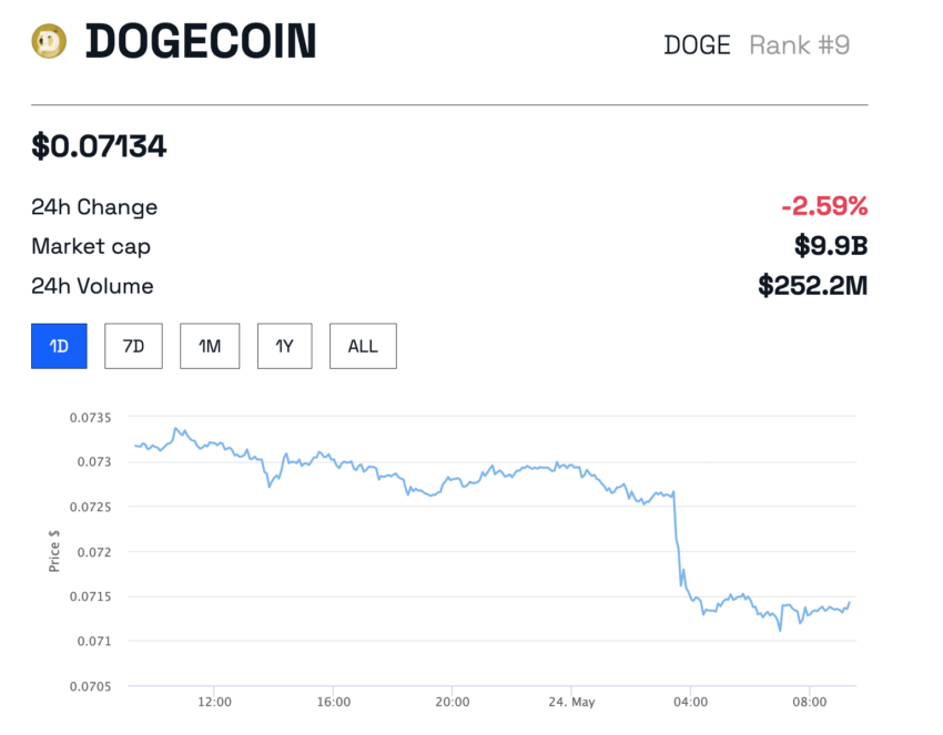 Au moment où nous écrivons ces lignes, la pièce canine s’échange à 0,074 $, en baisse de 2,59 % sur la journée. Notons toutefois que la plupart des autres meme coins sont dans le rouge en ce moment. D’ailleurs, l’ensemble du marché crypto est en difficulté aujourd’hui.