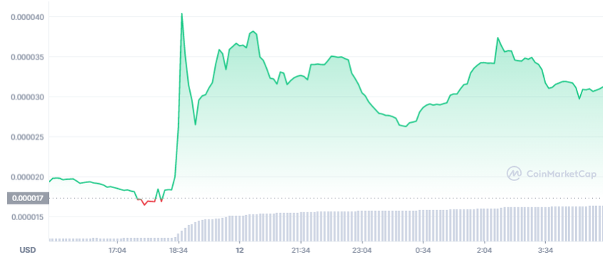 Au moment de la rédaction de cet article, le cours de la cryptomonnaie-mème a toutefois considérablement rebaissé. Cela dit, selon les données de CoinMarketCap, il se négocie toujours à 0,000000007433 $, ce qui correspond à une hausse de plus de 1 000 % sur les dernières 24 heures.