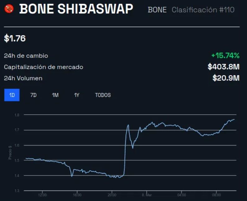 Désormais, BONE est classé 89ème dans le classement des cryptomonnaies. Ce, grâce à une capitalisation boursière en hausse et située à 403,8 millions de dollars.