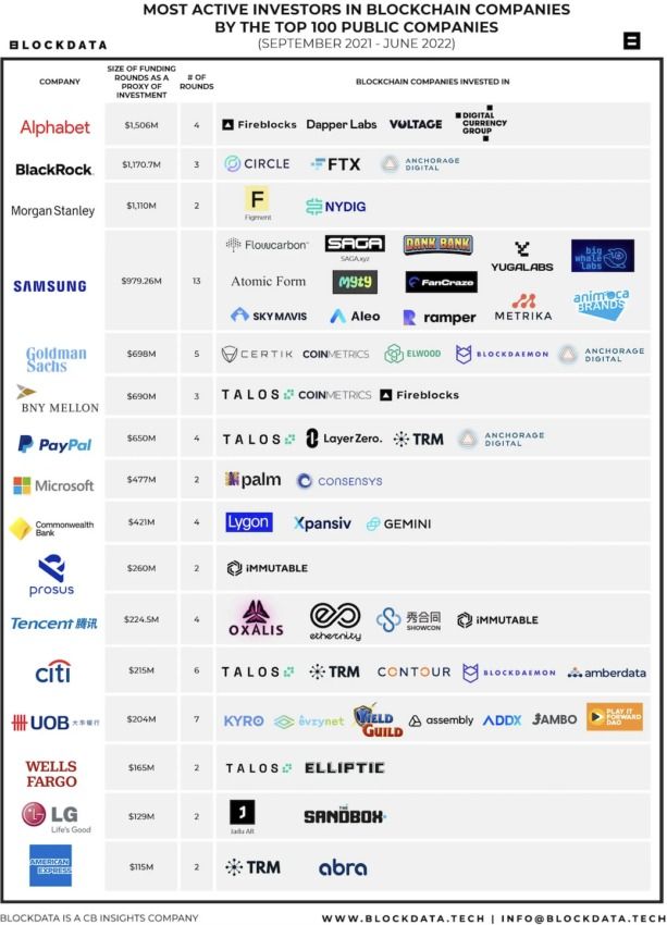 Entre septembre 2021 et juin 2022, le géant de la tech a investi 1,5 milliard de dollars dans quatre entreprises blockchain, à savoir : Fireblocks, une plateforme de garde d’actifs numériques, Digital Currency Group, une société de capital-risque, Voltage, une plateforme d’infrastructure de nœuds Lightning et Dapper Labs, une société de jeux blockchain.