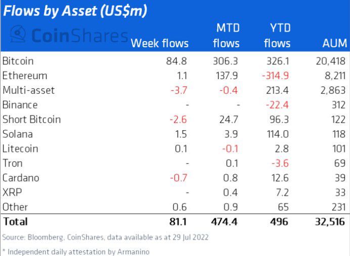 Pour la semaine se terminant le 29 juillet, les investissements dans les produits d’actifs numériques ont marqué la sixième semaine positive consécutive, enregistrant des investissements de 81 millions de dollars.