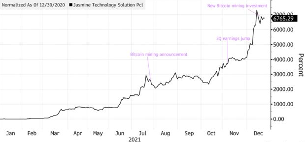La société de technologie thaïlandaise Jasmine Technology a connu une hausse considérable du cours de son action après avoir lancé une unité de minage Bitcoin plus tôt cette année. Elle figure actuellement parmi les top performers du marché mondial.