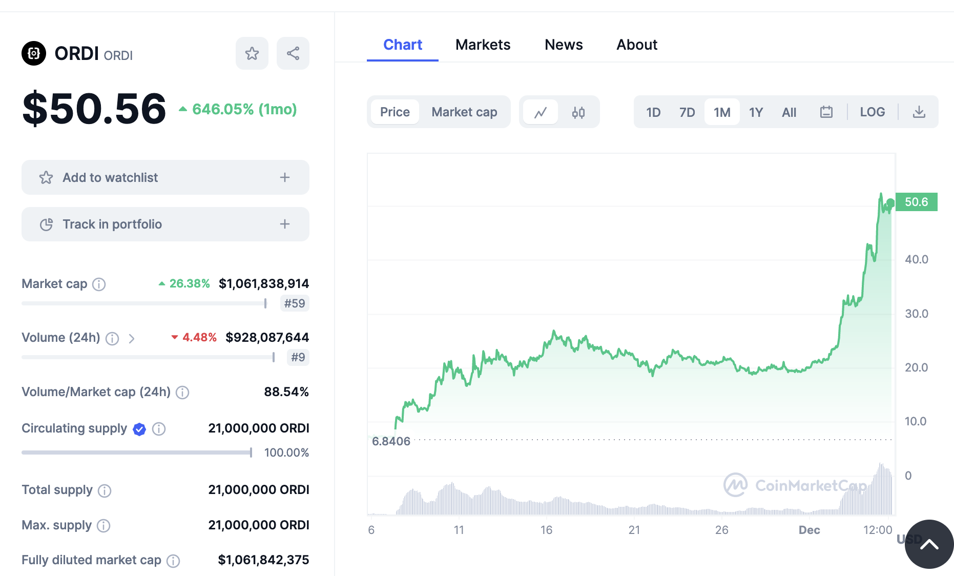 SponsoredLe projet, lancé seulement cette année, vient d’atteindre une capitalisation d’un milliard de dollars. Pour être plus précis, la market cap de l’ORDI s’élève à 1,250 milliard de dollars et se positionne à la 53ème place du marché crypto. Tout comme pour Bitcoin, l’offre maximale de jetons ORDI est plafonnée à 21 millions de jetons.
