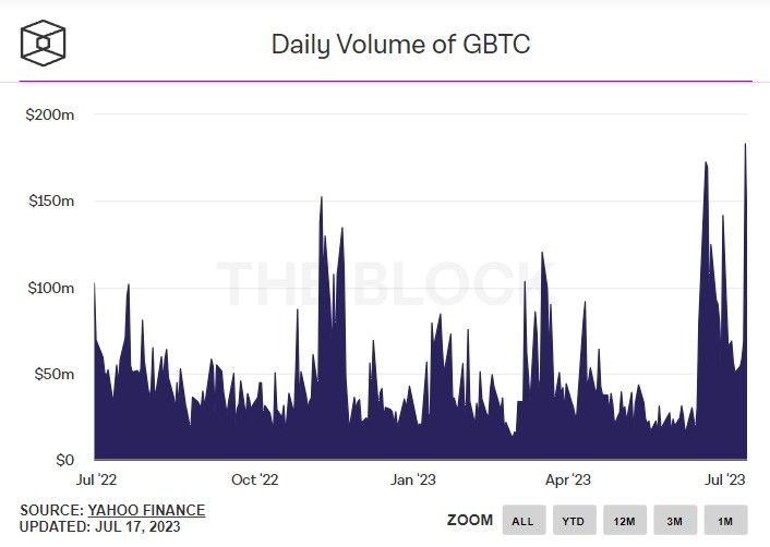 Si l’on en croit de récentes données publiées par The Block, le volume d’activité du GBTC a explosé la semaine dernière suite à une vague de dépôts. Cela a permis d’atteindre un nouvel ATH de 183 millions de dollars.