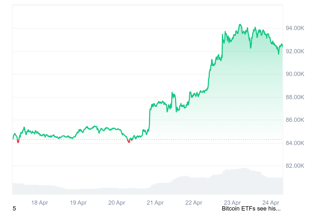 En réponse à ces nouvelles positives, le prix du BTC a lui aussi grimpé en flèche. En début de semaine, le jeton a amorcé un rallye haussier qui l’a temporairement propulsé au-dessus des 94 000 $.