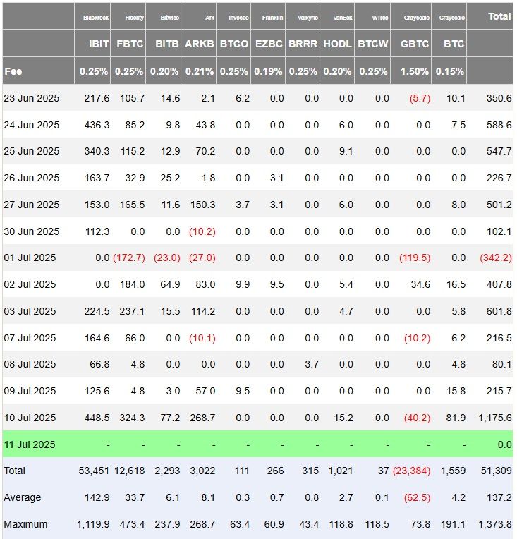 D’après les données de Farside, les ETF Bitcoin ont totalisé 1,175 milliard de dollars entrants hier avec notamment 448,5 millions de dollars du côté de l’ETF de BlackRock. Bien entendu, les achats ne datent pas que d’hier, car entre le 23 juin et maintenant, une journée seulement s’est soldée négativement.