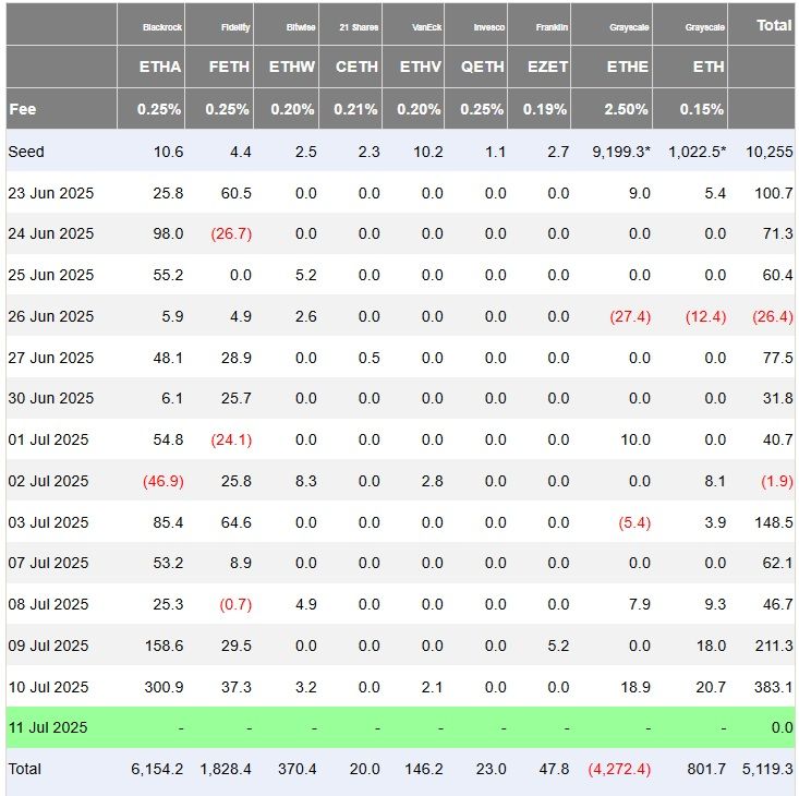 Avec 383,1 millions de dollars dépensés, les ETF Ethereum ont confirmé l’attractivité des ETF crypto et le désir massif d’accumulation. Là aussi, c’est le fonds de BlackRock qui s’est montré le plus dépensier avec un déboursement de 300,9 millions de dollars. Pour Ethereum, l’accumulation à travers les ETF crypto se rapproche des 900 millions de dollars et dépasse d’ores et déjà les résultats d’avril ou mai.