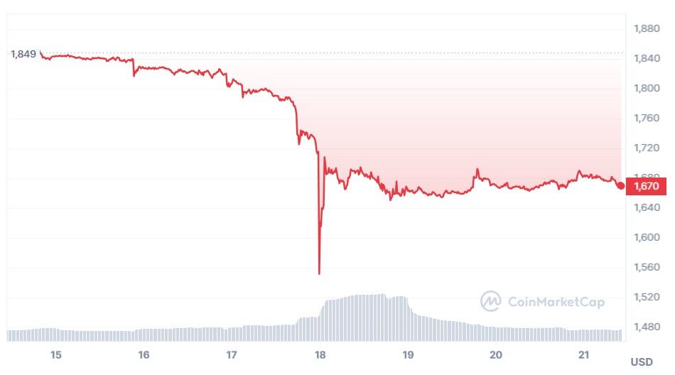Descendu aux alentours des 1 600 $, Ethereum attend toujours la 📈 remontée tant promise par les analystes. Néanmoins, à l’heure de la rédaction de cet article, la création de Vitalik Buterin continue de stagner.
