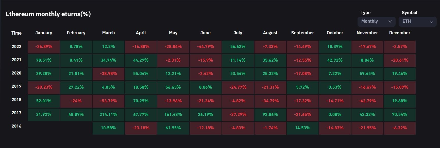 Ainsi, quatre mois de l’année seulement se sont soldés positivement pour Ethereum, alors que historiquement, l’actif réalisait des performances plus notoires sur les précédentes années. En effet, alors que Bitcoin a eu davantage de difficultés sur l’année 2021 avec un creux sur la fin du printemps et une autre baisse qui s’est amorcée en novembre, ETH a connu de nombreux mois dans le vert et une chute beaucoup plus modérée sur mai et sur juin de l’année 2021.