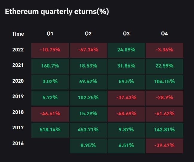 Si l’on se focalise sur du plus long terme, on peut remarquer qu’au niveau trimestriel, l’année 2021 rejoint celle de 2018 comme la pire année pour Ethereum. En effet, l’actif a terminé 3 trimestres sur quatre dans le rouge comme en 2018. A l’opposé, 2017, 2020 et 2021 étaient des années fastes, avec des clôtures trimestrielles à chaque fois dans le vert. En 2022, ETH a cependant souffert, mettant fin à sa belle évolution sur les années précédentes.